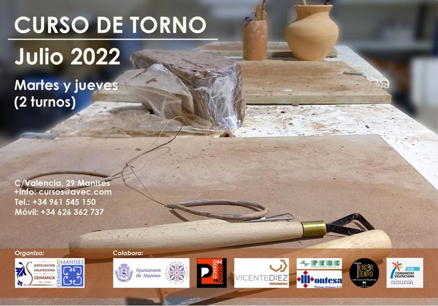 La Asociación Valenciana de Cerámica AVEC-Gremio presenta el curso de torno que se impartirá los martes y jueves, del día 5 al 28 de julio de 2022, en los talleres de esta asociación en Manises, Valencia