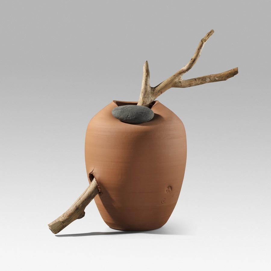 Martín Azúa, diseño y Marc Vidal, producción Gerro, 2017. Arcilla roja. Cocción baja temperatura, Piedra, rama. 93 x 35 x 35 cm. Donación Martín Azúa, 2021.
