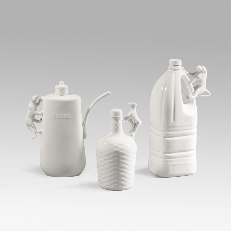 Yukiko Kitahara. Taller Kúu. Aceitera; Botella Ramón; Botella mono. Colección ‘Usar y no tirar’, 2014. Porcelana. Colada. 21 x 16 x 5,3 cm. Donación Yukiko Kitahara. Taller Kúu, 2020.