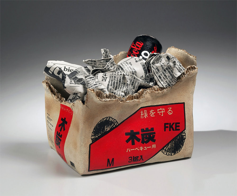 Foto: Escultura de una caja de carbón rellena de papel de periódico y una lata de refresco, 2012. Gres y esmaltes. 23 × 30,3 × 21,8 cm. Vendida en la Galería Joan B. Mirviss, de Nueva York.