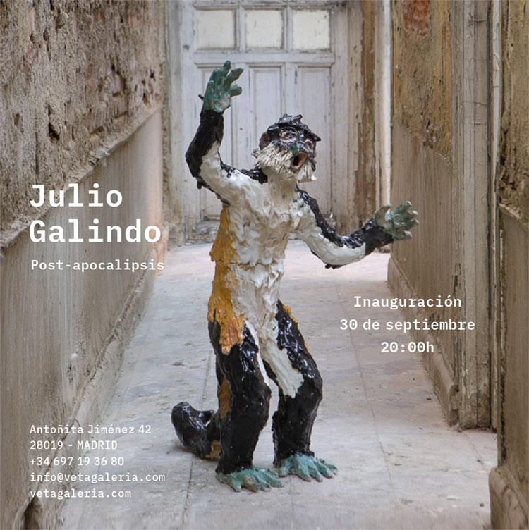 La galería madrileña Veta presenta la exposición “Post Apocalipsis”, del ceramista Julio Galindo que trabaja sobre la idea distópica en la que el ser humano se ha extinguido y ocupará una parcela en ruinas. Por su parte Santiago Ydáñez presenta, por primera vez óleos, con su habitual estudio del cuerpo humano y de la mirada