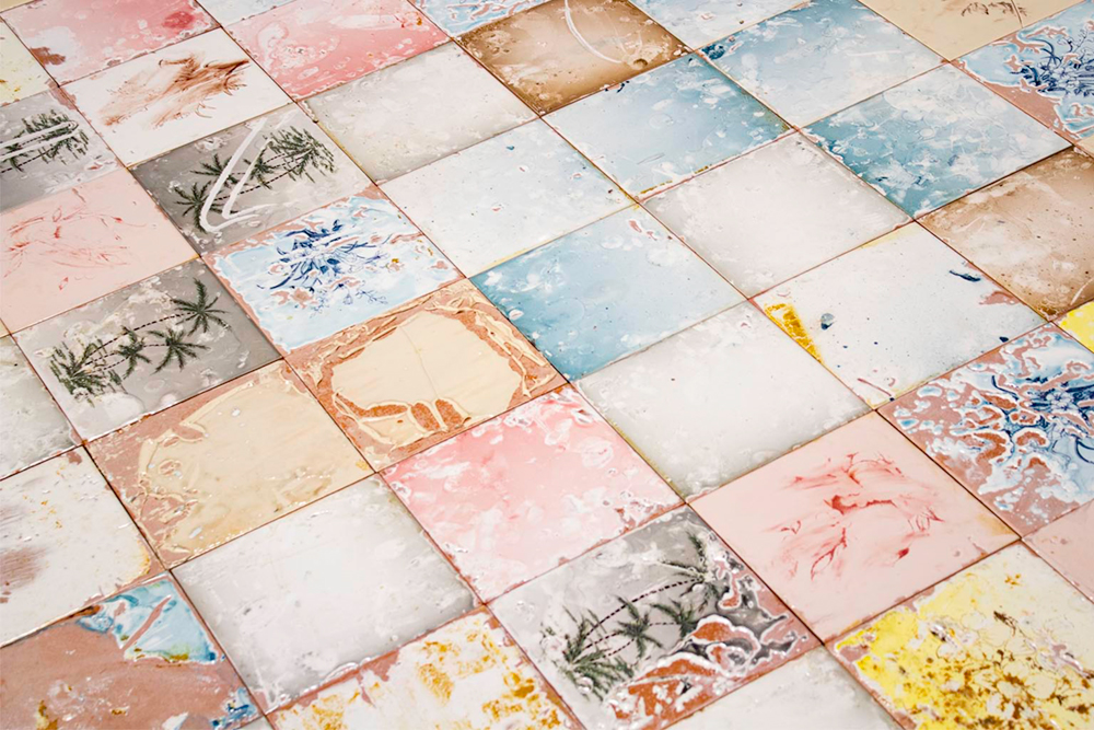 El espacio ha ido aceptando nuestra presencia y se empieza a intuir lo que trata de comunicar. En la fabrica hay mucha materia abandonada: azulejos rotos, pintados y sin pintar; hay azules, rojos, amarillos, verdes; con estampaciones, en crudo, sin hornear; hay esmaltes y engobes por doquier, hornos rotos, vigas colgando y tejados caídos. Entran los rayos del sol por agujeros y las piscinas de esmalte tienen nombres como ¨verde avocado”o “gris amsterdam”.