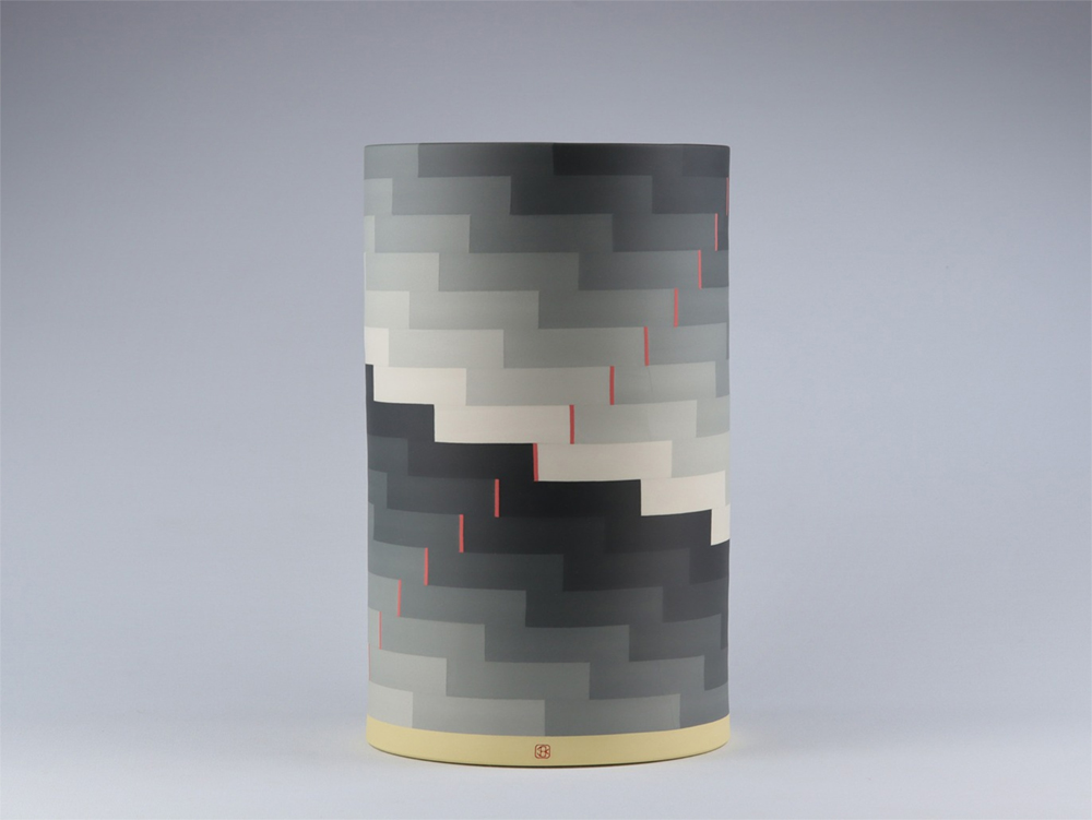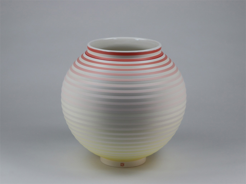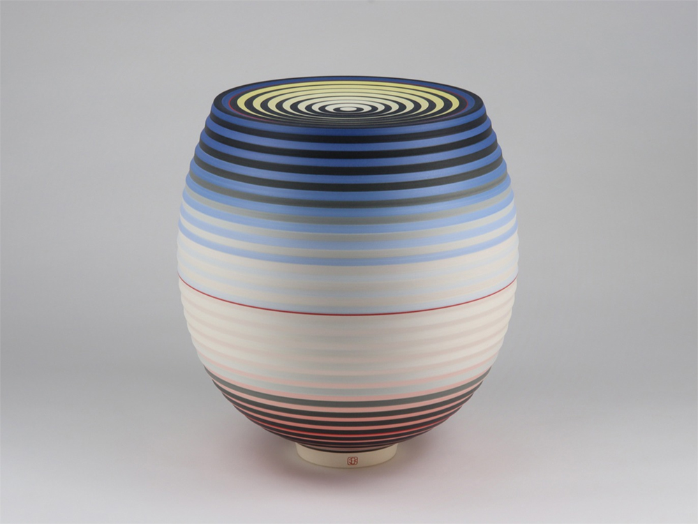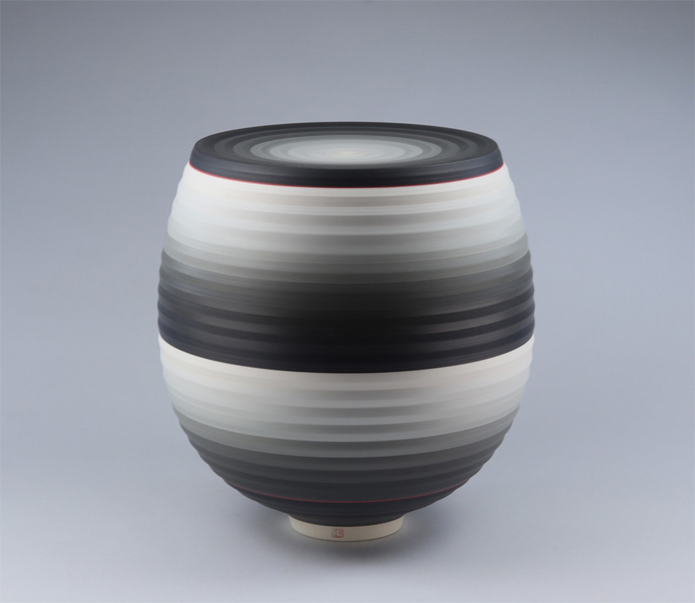 La obra de Jin Eui Kim se originó a partir de un simple fenómeno óptico que observó mientras hacía marcas repetitivas en el cuerpo de arcilla, lo que le llevó a preguntarse por qué y cómo veía lo que veía. Pensó que investigar más estos fenómenos ópticos le permitiría desarrollar su práctica artística y llevar estos efectos visuales hasta sus límites. El artista explora cómo puede manipularse la percepción de formas cerámicas tridimensionales mediante la aplicación de diferentes disposiciones tonales en sus superficies. Así, las obras de las series denominadas “OPject-Spherical Form” (formas cerradas) y “OPot-Moon Jar” (formas abiertas) están decoradas con una gama cromática de 34 engobes. Dependiendo de la disposición, y mediante diversos gradientes de anchura, intervalo, tono y contraste, pueden aparecer efectos ópticos que influyen significativamente en la percepción de las formas tridimensionales reales.