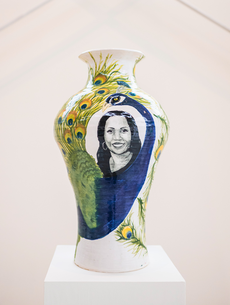 Entre las nuevas obras de cerámica de la exposición se incluyen al menos ocho vasijas de gran tamaño y juegos de té más íntimos, con nuevos temas que abordan acontecimientos recientes como la confirmación de la juez Ketanji Brown Jackson en el Tribunal Supremo (primera mujer de color en acceder a ese cargo) y la localidad en la que se ubica de Grounds For Sculpture, incluidos sus icónicos pavos reales. El entresuelo de la galería incluye una selección de obras de otros artistas, comisariada por Lugo, que explora el tema de la tutoría en el desarrollo de su práctica.
