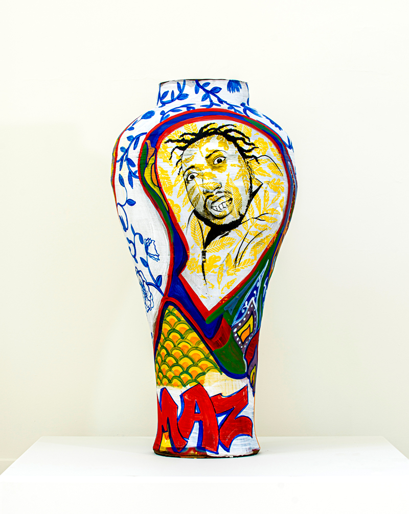 Roberto Lugo, nacido en Kensington, Filadelfia, de padres puertorriqueños, exploró sus inquietudes artísticas durante su juventud como grafitero, antes de centrar su actividad en la cerámica. En su obra, Lugo utiliza diferentes pastas, aunque es el uso de la porcelana donde encontramos que su trabajo trasciende la decoración, creando un contraste entre la tradicional historia “aristocrática” de este material y los temas clave de su discurso artístico, que no son otros que las cuestiones sociales de la América en la que vive: equidad, acceso y justicia social y racial, así como la identidad de la sociedad “no-blanca”. Para crear este diálogo utiliza las formas de la cerámica tradicional china con los diseños y colores del grafiti; desde el punto de vista de narración se suele centrar en los retratos de personas de color, iconos de la cultura y la historia contemporáneas, desde Sojourner Truth, el Dr. Cornel West y The Notorious BIG, hasta los miembros de su propia familia y, en ocasiones, él mismo.