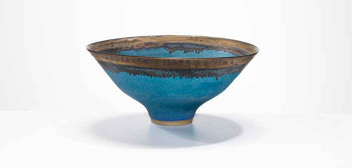 Lucie Rie, Cuenco turquesa con borde de bronce, años 1980. Gres. The Derek Williams Trust en préstamo a largo plazo a Amgueddfa Cymru-Museo Nacional de Gales. Imagen cortesía de Erskine, Hall & Coe; Fotografía de Michael Harvey.