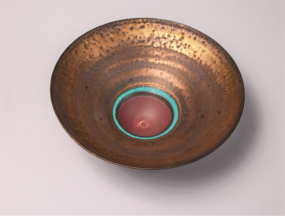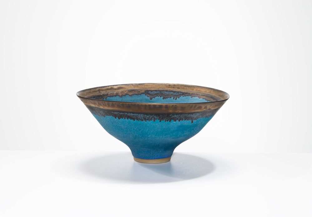 Lucie Rie, Cuenco turquesa con borde de bronce, años 1980. Gres. The Derek Williams Trust en préstamo a largo plazo a Amgueddfa Cymru-Museo Nacional de Gales. Imagen cortesía de Erskine, Hall & Coe; Fotografía de Michael Harvey.