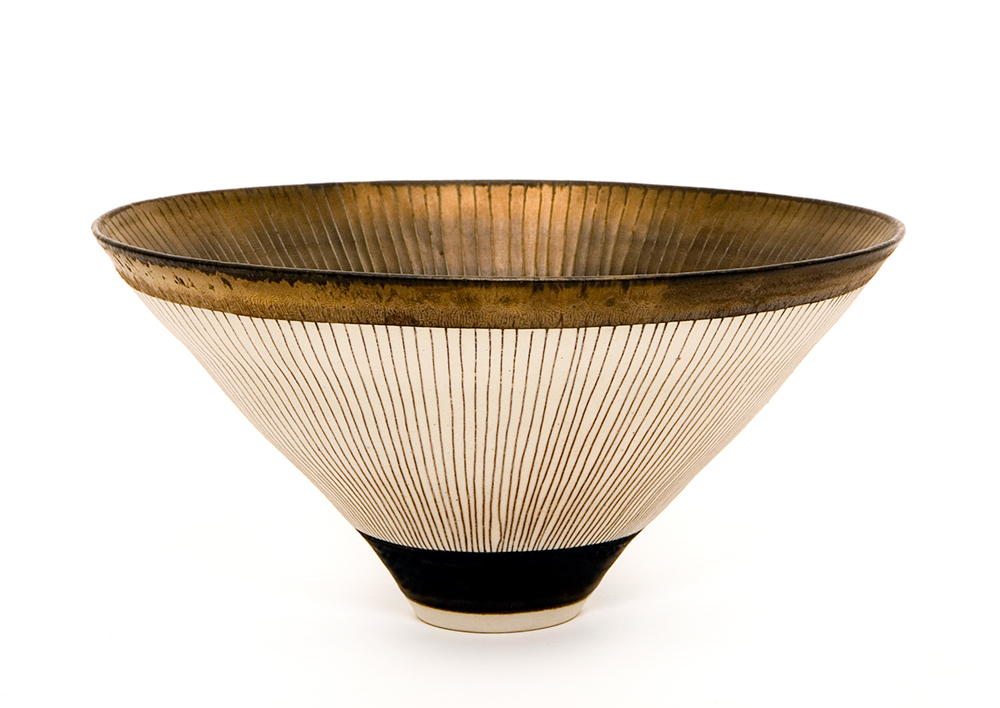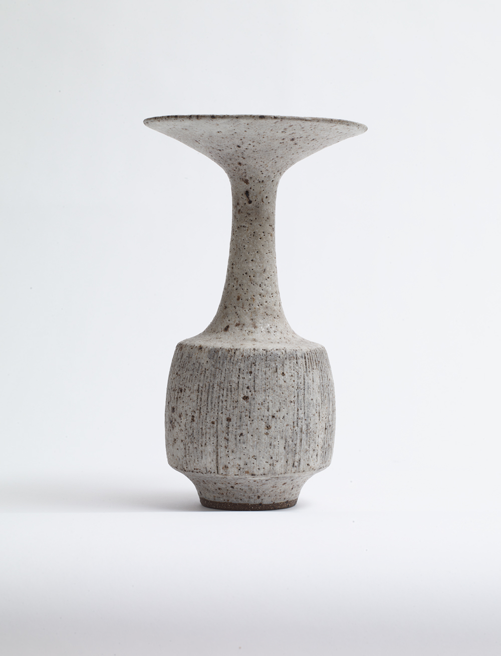 Lucie Rie. Jarrón, década de 1970, gres, engobe de porcelana y esmalte de dolomita con líneas verticales incisas. Del Crafts Centro de Estudios de Artesanía, Universidad de Artes Creativas, P.76.5. ©Propiedad de Lucie Rie. Fotografía: Galería Whitechapel / Stephen White Photography.