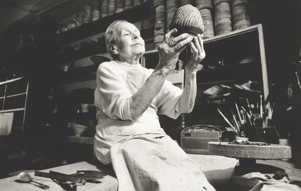 Lucie Rie en su estudio de Albion Mews, años 90. Del Centro de Estudios de Artesanía, Universidad de Artes Creativas, RIE/20/1/11. © Estate of Lucie Rie / Times Newspapers Ltd.