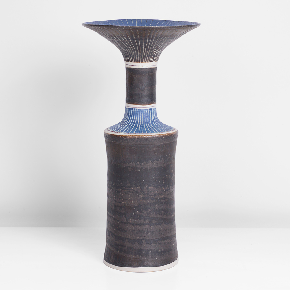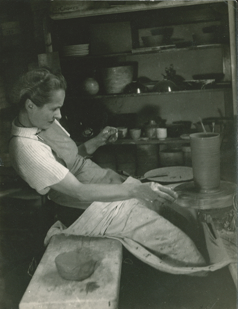 Rie, una de las pocas mujeres que trabajaban la cerámica de forma independiente en Gran Bretaña, forjó constantemente su propio camino. Reestableció su carrera en Londres después de la guerra, ganando reputación por su refinada vajilla y sus cuencos y jarrones únicos. Su obra, llamativa por su modernidad e individualidad, se distinguía de la de otros ceramistas ingleses que se inspiraban sobre todo en las tradiciones medievales y de Asia oriental. No obstante, Rie se inspiró en muchas fuentes, como la cerámica neolítica y de la Edad de Bronce, el diseño moderno y el mundo natural. Las obras de este periodo muestran el uso característico de Rie del esgrafiado (diseños lineales grabados) y el uso pictórico y expresivo de los esmaltes. En constante experimentación, Rie desarrolló formas, colores y superficies que ampliaron los límites de la cerámica de estudio. Inusualmente, sus vasijas sólo se cocían una vez y los esmaltes se aplicaban con pincel cuando la arcilla aún estaba cruda y sin cocer.