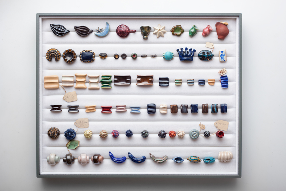En 1938, Rie huyó de Austria para escapar de la persecución nazi de los judíos y se instaló en Londres, lo que marcó un antes y un después en su vida y su obra. Durante la II Guerra Mundial se dedicó a hacer botones de cerámica para la industria de la moda, experimentando con formas en miniatura y nuevos esmaltes. La Aventura de la Cerámica presenta una selección de botones con formas anudadas y retorcidas que la artista utilizó para estudiar la forma, el color y la textura a pequeña escala.