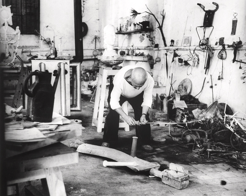 André Villers. Picasso en el estudio Fournas, 1953. Impresión fotográfica en blanco y negro. Inv. 1993.9.44. 30 × 40 cm. Colección Musée Magnelli, Vallauris. (Imagen Arte – Claude Germain – ADAGP – ©Sucesión Picasso 2023.)