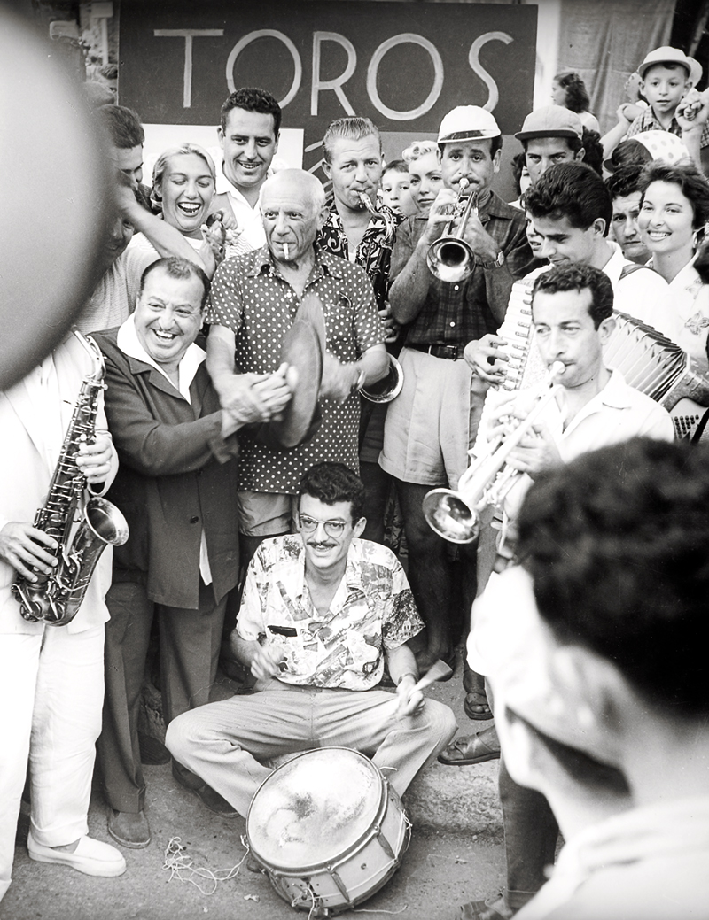 André Villers. Fiesta en Vallauris con los Merry Boys y Maya, 1955. Impresión fotográfica en blanco y negro. Inv. 1993.9.42. 40 × 30 cm. Colección Musée Magnelli. (Imagen Arte – Claude Germain – ADAGP – ©Sucesión Picasso 2023.)