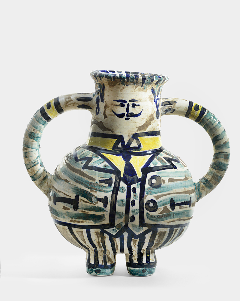 Pablo Picasso. “Hombre con traje”, 1953. Gran jarrón con dos asas (forma madoura). Terracota blanca. 46 × 26 × 49 cm. (Colección privada – ©Sucesión Picasso 2023.)