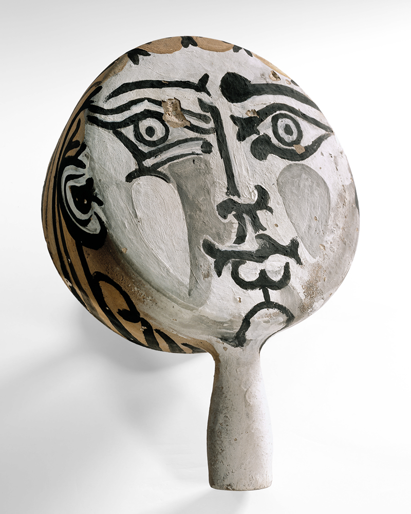 Pablo Picasso. “Visage”, 1950. Fechada en el mango: “12.8.50 IV”. Pieza única. Sartén Terracota chamota roja torneada. 11,5 × 34 × 23 cm. (Colección particular – ©Sucesión Picasso 2023.)