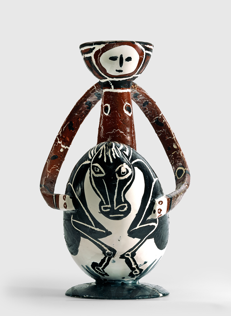 Pablo Picasso. “Le cavalier”, 1950-1951. Pieza única. Jarra de vino diseñada por Picasso. 41,4 × 32 × 26 cm. Colección particular. (©Sucesión Picasso 2023.)