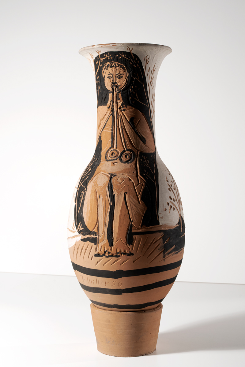 Pablo Picasso. “Flûtiste et joueur de diaule”, 1950. Pieza única. Ánfora sobre base, terracota ocre torneada. Decoración pintada en blanco y negro, grabada antes y después de la cocción. 59,5 × 23 cm. Colección particular (©Sucesión Picasso 2023.)