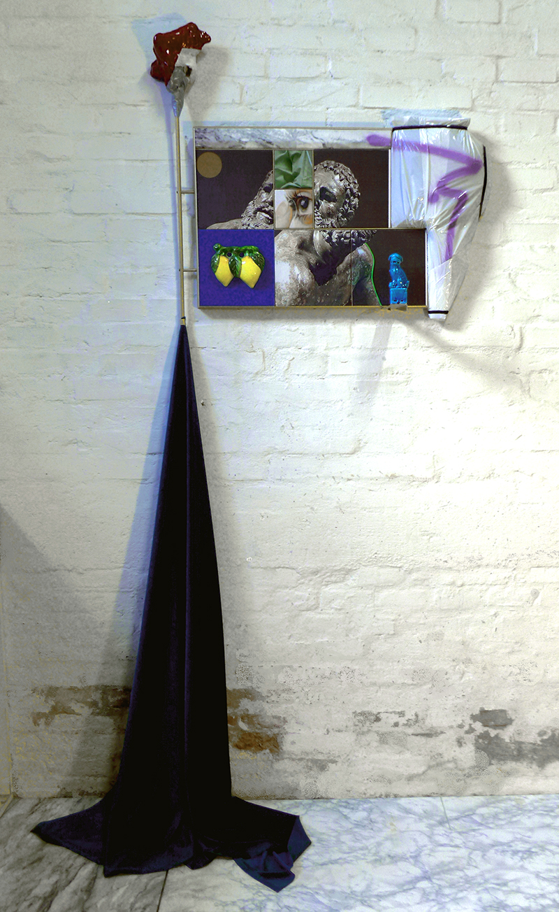 Premio Rotary. Marco Samorè, “Zopranol 30”, 2022, Calcomanía digital con pigmentos cerámicos sobre azulejos de terracota de mayólica roja, plástico, hoja de latón, pintura en spray y tela.