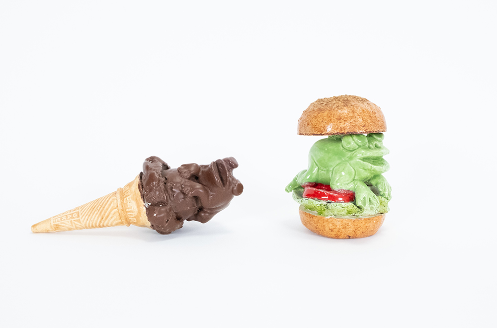 David Gilhooly. “Untitled (Helado)”, 1978. Cerámica, 13,3 × 9,5 × 10,8 cm. “Untitled (Hamburguesa), 1978. Cerámica, 12.7 × 10,7 × 8,9 cm. (Collection of the American Museum of Ceramic Art; gift of Igal and Diane Silber.)