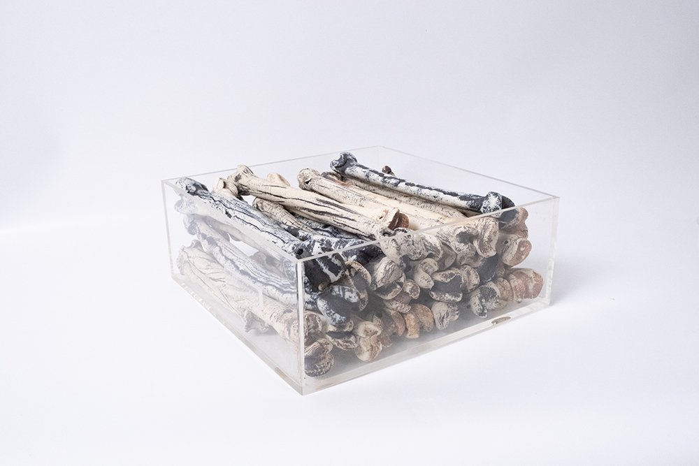 Ulla Viotti. “Boxed Bones”, 1985. Huesos de cerámica y caja de plástico. 10,1 × 25,4 cm. (Collection of the American Museum of Ceramic Art; gift of Igal and Diane Silber.)