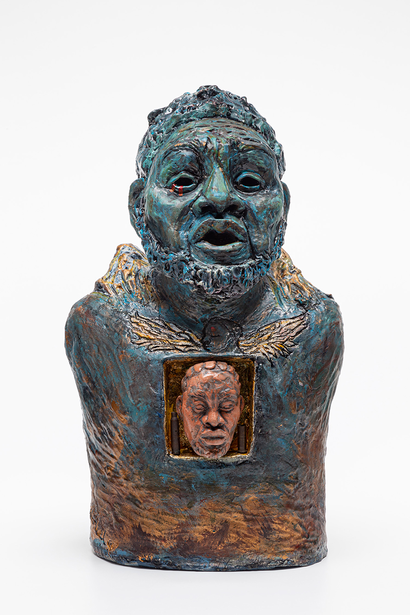Janathel Shaw. “Grief for Philando Castile”, 2018. Gres, esmalte bajo cubierta, esmalte, acrílico, pan de oro, terracota y casquillos de bala. 66 × 35,6 × 38 cm. Cortesía de la artista.