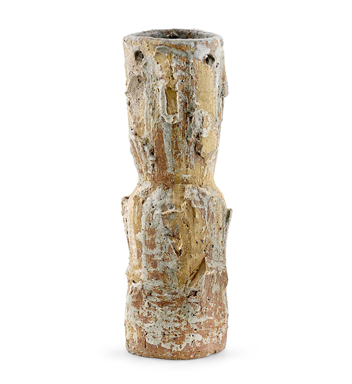 Milton Moon. “Fairweather”, 1966. Tarragindi, gres de Brisbane, forma cilíndrica acampanada con decoración caligráfica a pincel sobre esmalte de ceniza. Alto, 40 cm. Donación de Patrick y Pam Wilson 1987, Galería de Arte de Queensland | Galería de Arte Moderno, © Estate of Milton Moon, foto: Natasha Harth.