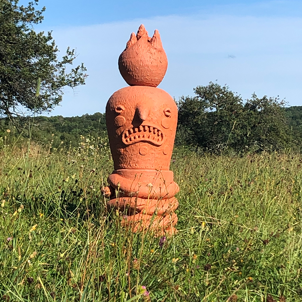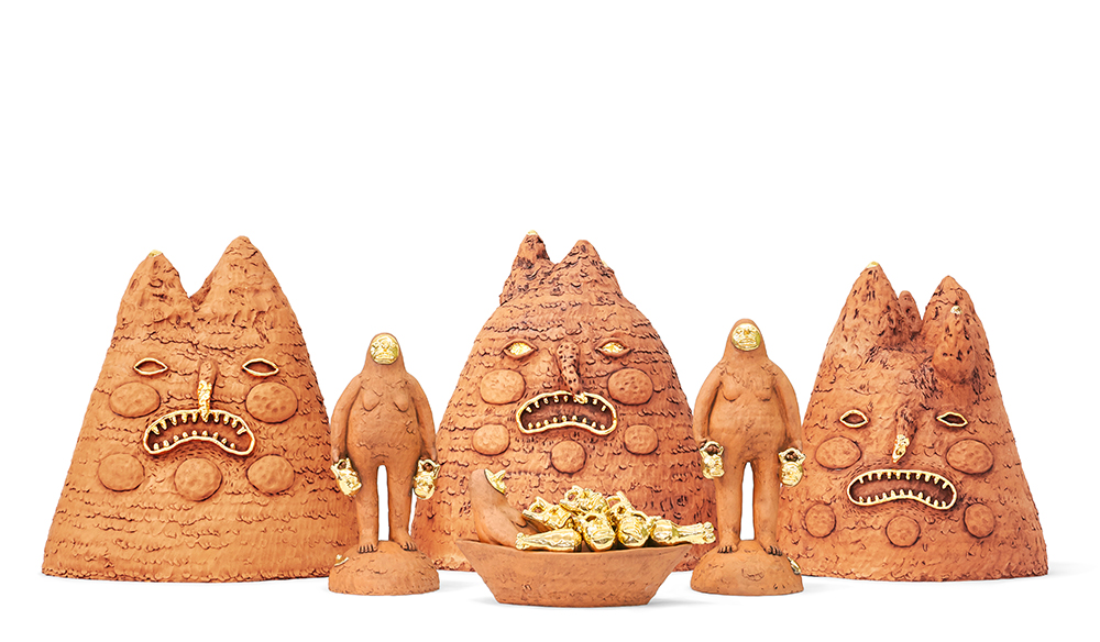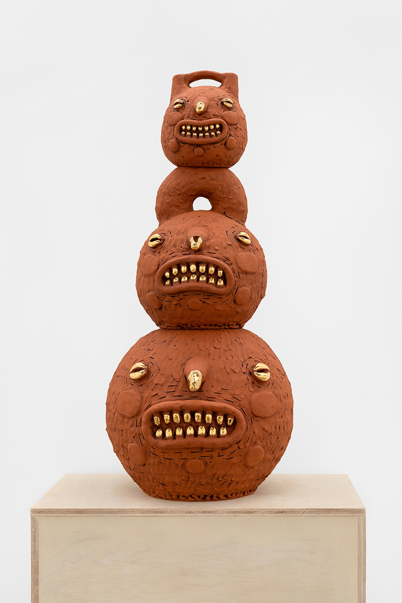 “Bajo Ella”, 2022. Serie “Cosmic Skin Women”. Arcilla roja, esmalte y lustre dorado. 20,3 × 20,3 × 53,4 cm. Chris Stone.
