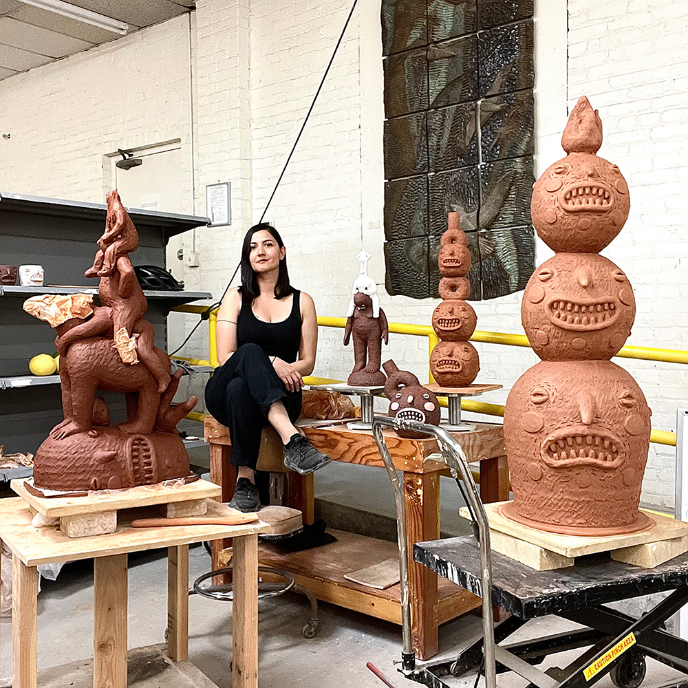 En mi trabajo, soy una narradora. Cuento historias sobre la inmigración de mi familia colombiana, sobre la presencia sudamericana precolombina y sobre mi infancia americana como “niña de la llave”, llena de dibujos animados extraescolares. Todas estas historias se combinan para crear un autorretrato multicomponente de lo que significa ser un híbrido mestizo colombiano-americano. Extrayendo fragmentos de la investigación histórica, los relatos familiares y la cultura de los dibujos animados, creo historias surrealistas en arcilla, como Gabriel García Márquez hacía con las palabras, narrando autobiográficamente la historia con sus altibajos, su humor y sus lágrimas.
