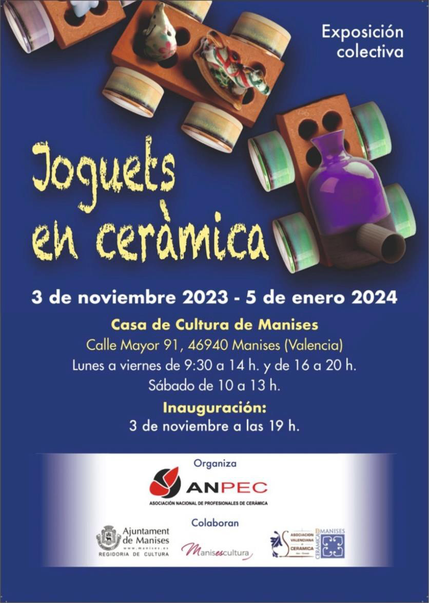 La Asociación Nacional de Profesionales de Cerámica (ANPEC) presenta, del 3 de noviembre al 5 de enero, en la sala “Ceramista Gimeno” de la Casa de la Cultura de Manises (Valencia) la exposición “Joguets en cerámica”