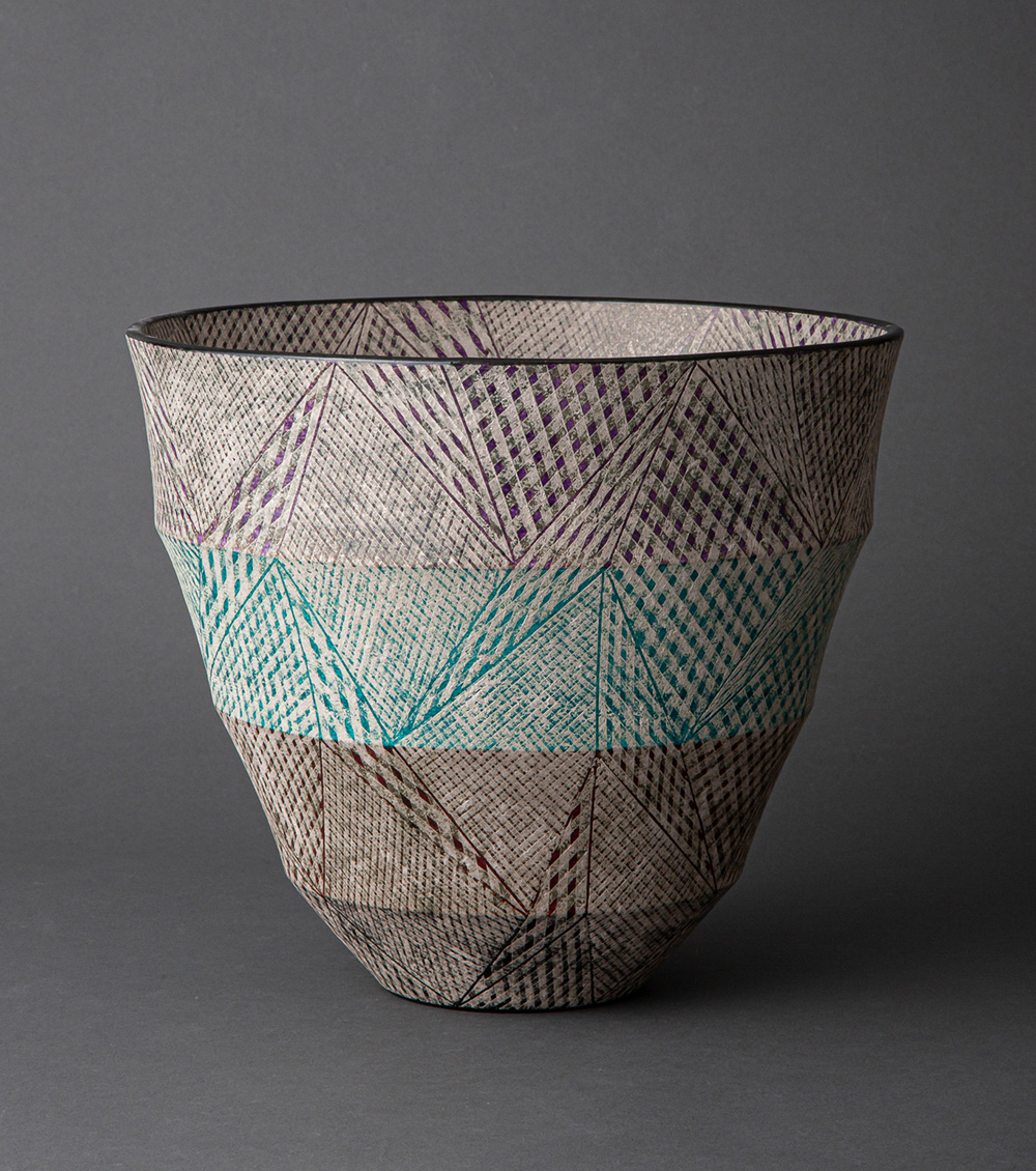 MAEDA MASAHIRO (n. 1948). Gran recipiente cónico escalonado en negro y verde azulado con motivos lineales plateados, 2022. Porcelana iro-e con plata sobrecubierta. 25,1 × 28,3 × 28,3 cm. Fotografía de Noda Kōichi. Cortesía de Joan B Mirviss LTD.