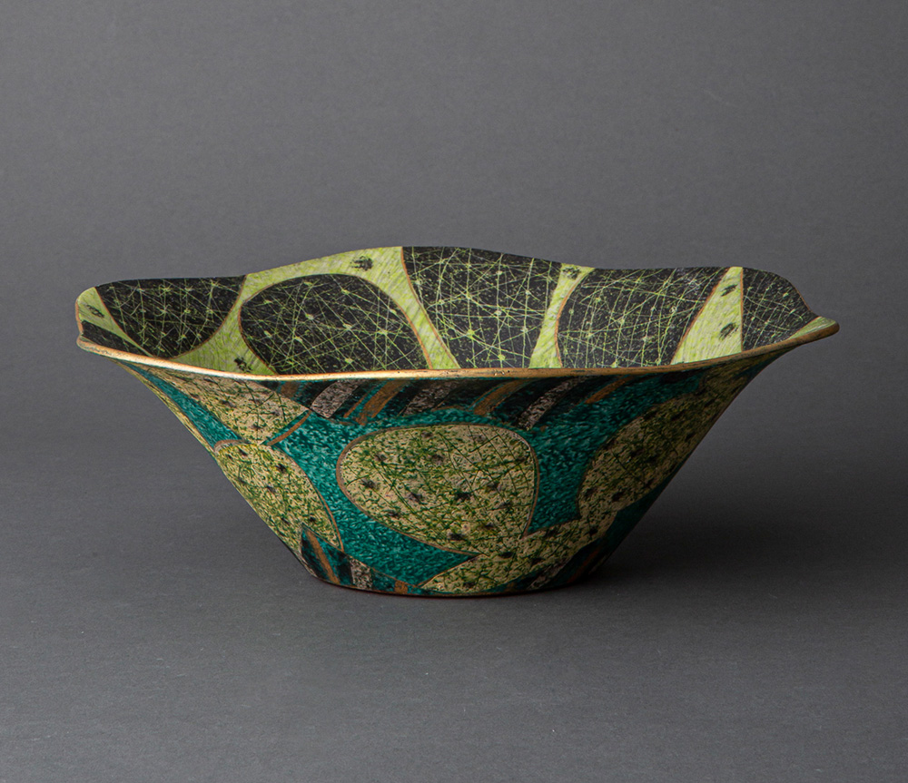 MAEDA MASAHIRO (b. 1948). Cuenco grande con borde foliado, decorado con motivos de cactus verdes, 1995. Porcelana “iro-e” con oro y plata sobrecubierta. 15 × 28 × 28 cm. Fotografía de Noda Kōichi. Cortesía de Joan B Mirviss LTD.
