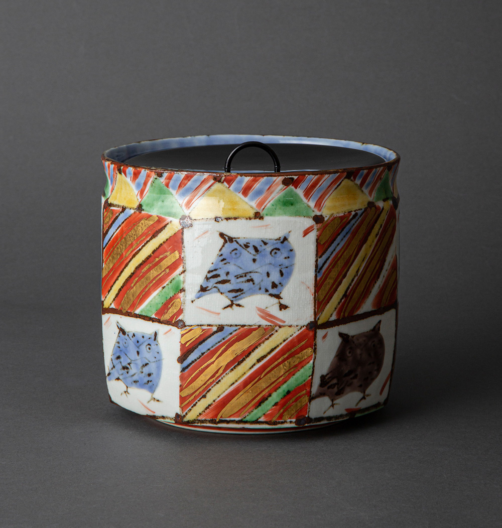 MAEDA MASAHIRO (n. 1948). Jarro de agua facetado decorado con paneles con motivos de búhos, 1980. Porcelana “iro-e”, tapa lacada. 15 × 15,9 × 15,9 cm. Fotografía de Noda Kōichi. Cortesía de Joan B Mirviss LTD.