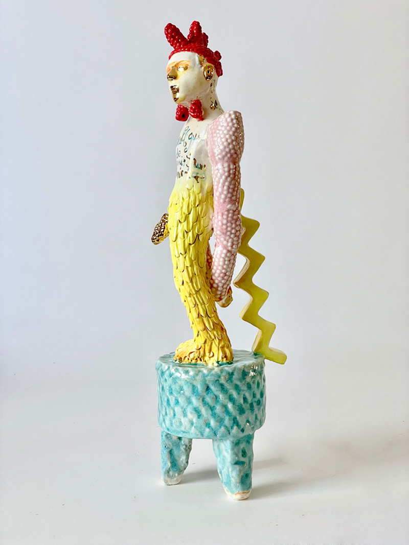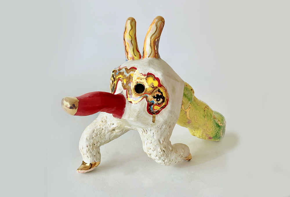 Las piezas, que componen la obra son –tanto cerámicas como grabados– en cierto modo, arquetípicas, telúricas y psicopompas. Se relacionan con el acervo cultural, con el pensamiento comunitario, con el mito y el cuento. Son psicopompas porque no olvidan la muerte, ni el mundo de ultratumba, lo funesto, lo oscuro y lo sagrado. Pero son esperanzadoras, llenas de colores (de nuevo, el escudo, la máscara), vivaces, divertidas, llamativas, pero algo inquietantes. Son telúricas porque se nutren de lo cotidiano, del mundo animal, floral y mitológico. Están ancladas en lo terrenal, en las narraciones y las historias, en la realeza, en lo abstracto, lo extraño y lo cercano, las aventuras y las posibilidades.