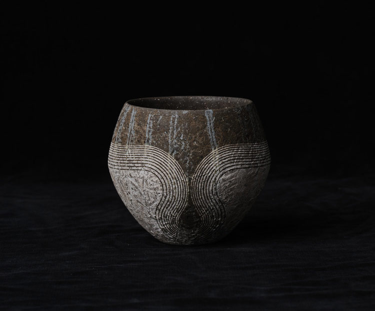 La ciudad de Mooka, donde Iguchi nació y creció y donde ahora tiene su estudio, está situada junto a la conocida ciudad alfarera de Mashiko, en la prefectura de Tochigi. Aunque su familia no estaba relacionada con la industria cerámica, Iguchi estudió arte cerámico en la Universidad de Arte y Diseño de Tohoku y en el Centro de Tecnología Industrial de la prefectura de Tochigi, y más tarde fue aprendiz de Uraguchi Masayuki, un artista ceramista que producía cerámica celadón en Ibaraki. El estilo actual de Iguchi es completamente diferente del celadón, que destaca por el color y la textura de su grueso vidriado. Quizá lo que descubrió durante su aprendizaje fue la dirección que quería seguir en su propia expresión: no a través de las reacciones químicas que se producen en los esmaltes durante la cocción, sino las expresiones que pueden lograrse en las superficies de arcilla cocida. Con el tiempo, Iguchi desarrolló formas de vasijas con superficies de arcilla vitrificada de textura oxidada. A estas obras las llama shuto (lit. “cerámica oxidada”). Incrustadas como si hubieran estado cubiertas de musgo durante muchos años, las superficies de sus vasijas son fascinantes.