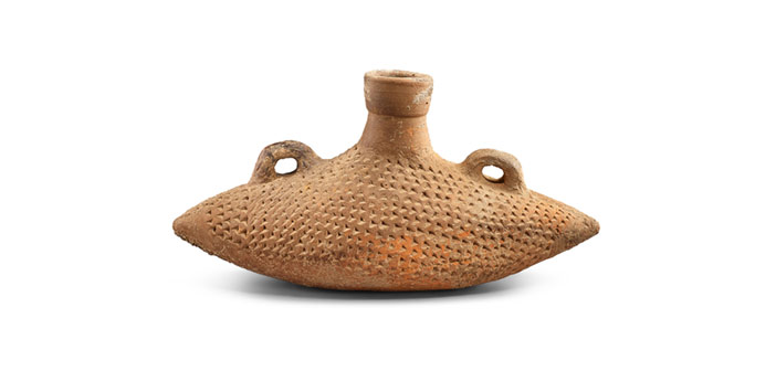 Esta pieza, de 32,5 cm de ancho, en forma de frasco o cantimplora, es una excepcional muestra de la cerámica neolítica de la cultura Yangshao, que floreció en el norte y centro de China, concretamente durante el período Banpo (4800-4300 a.C.)