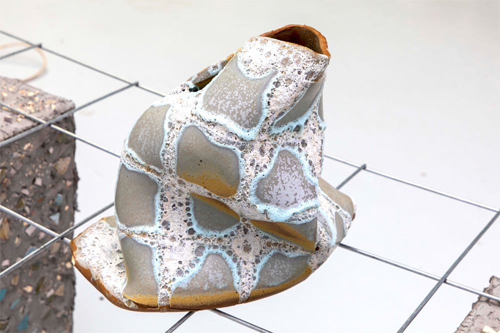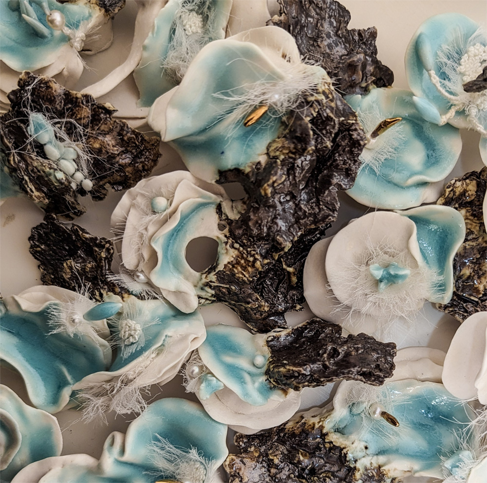 Preciosa, pequeña, orgánica e indefinida, esta serie de esculturas de la escultora canadiense Rachelle Chinnery representa la idea de un holdfast: el organismo de anclaje de algas marinas que mantiene la planta sujeta a una roca o concha del fondo marino. El anclaje asegura el enraizamiento de una planta que, de otro modo, flotaría libremente. Sin este vínculo, la planta queda a merced de las corrientes y las tormentas. Como vive en un entorno marino, la idea de un asidero le resultó útil para estabilizarse mientras empezaba un nuevo trabajo en el que nada le resultaba familiar. Centrarse en el tema del agua le permitió conocer la belleza del agua fresca y abundante de Roma, que brotaba de grifos y fuentes de mármol a cada paso. Con el tiempo, sus oscuras y salvajes tomas de agua de mar se transformaron en piscinas de agua dulce muy decoradas, fusionando de dónde venía con dónde está ahora.