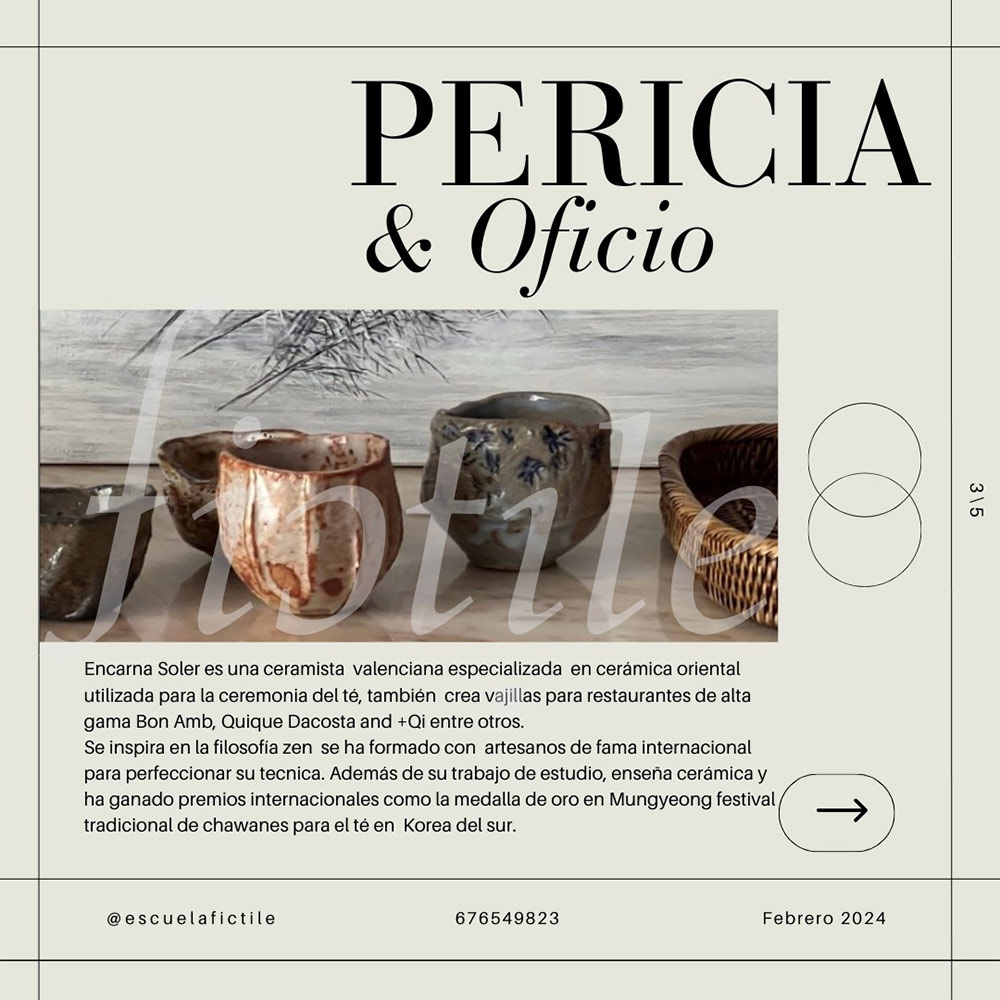 Del 26 de febrero al 6 de marzo, la ceramista Encarna Soler ofrece un curso dedicado a la realización de objetos para la ceremonia del té, que se impartirá en la Escuela de Cerámica Fictile, en Valencia