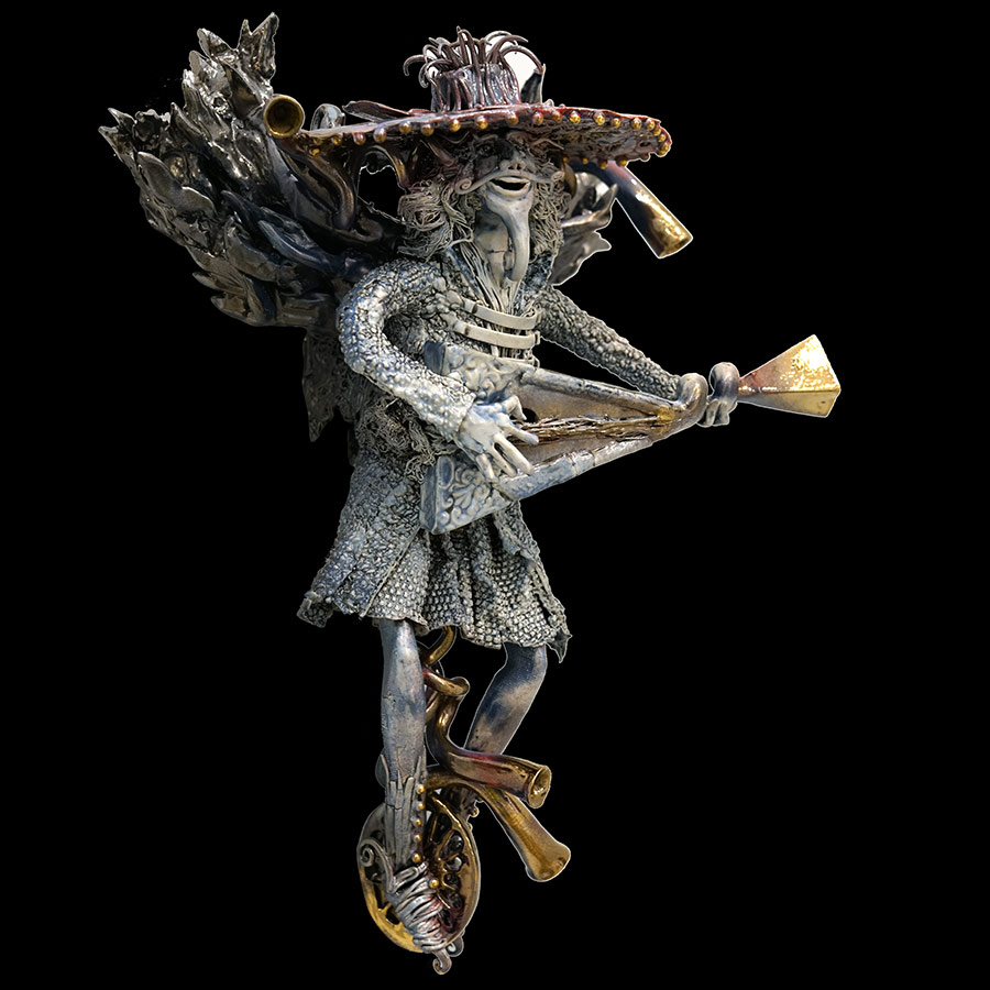 Kazimierz Kalkowski. “GRAJEK”. Gres y esmaltes y reflejo metálico dorado. Alto, 45 cm.