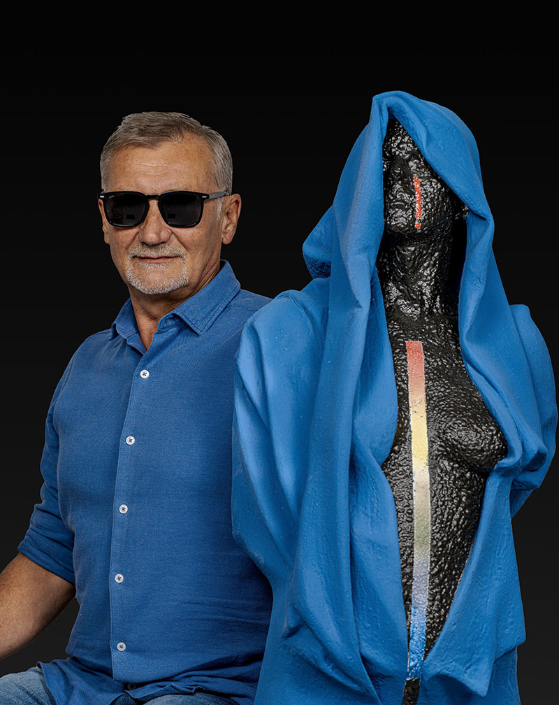 PRZEMYSŁAW LASAK nació en 1958. En 1980-86 estudió en la Academia de Bellas Artes de Wrocław. Profesor en su alma mater desde 1987 . Ha expuesto en todo el mundo. Es ante todo pintor y escenógrafo. Viste a sus figuras -fundidas a partir de cuerpos humanos reales-, las disfraza, les pinta tatuajes, les pone extrañas armas en las manos y ricos cascos, coronas y yelmos en la cabeza. La primera figura moldeada fue él mismo. Agazapado en una pose de espera, un guerrero. Listo en cualquier momento para despertar de su letargo y atacar. Hermoso, pero amenazador e incalculable. Luego vinieron figuras de mujeres, bellas en sí mismas, pero “disfrazadas” por Przemek. Con el tiempo, también figuras masculinas. Tecnológicamente, parece que el artista y el modelador sacan un molde de escayola de una persona viva. El molde es grande y muy pesado, el proceso de elaboración largo. A continuación, el artista prepara el molde afinando los detalles y funde, o imprime, la figura a partir de la masa de arcilla. Y entonces comienza la verdadera creatividad y diversión…. Przemek Lasak es una estrella del diseño de vestuario, decorados y ambientes.