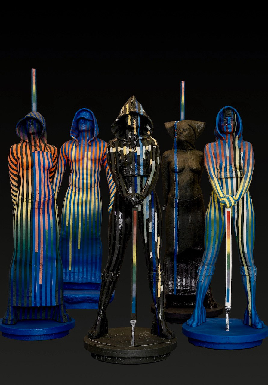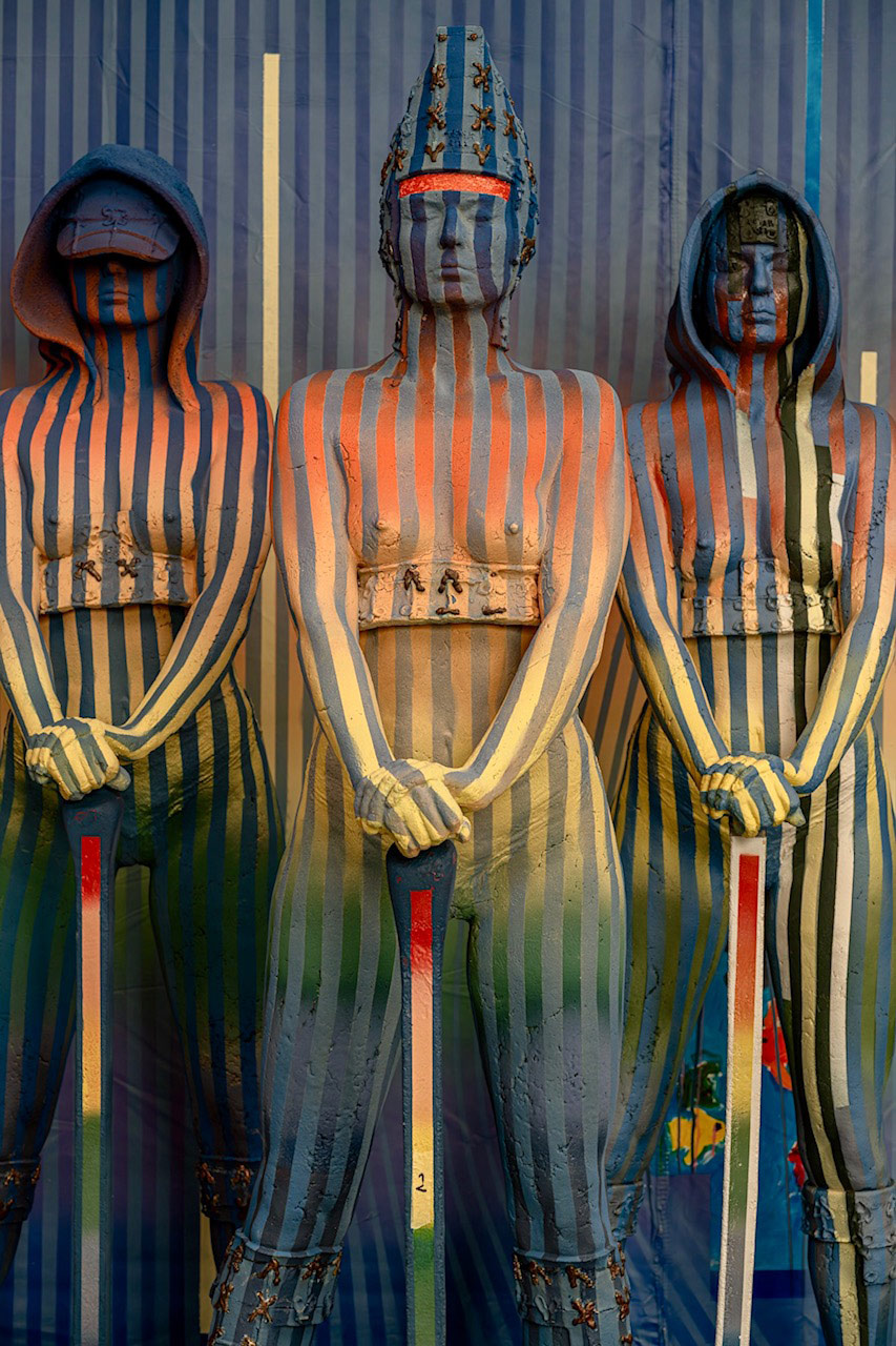 Przemyslaw Lasak. “TĘCZOWE DZIEWCZYNY”. Pasta chamotada modelada a mano y con moldes y esmaltes. Figuras de tamaño natural: 180, 189 y 179 cm de alto.