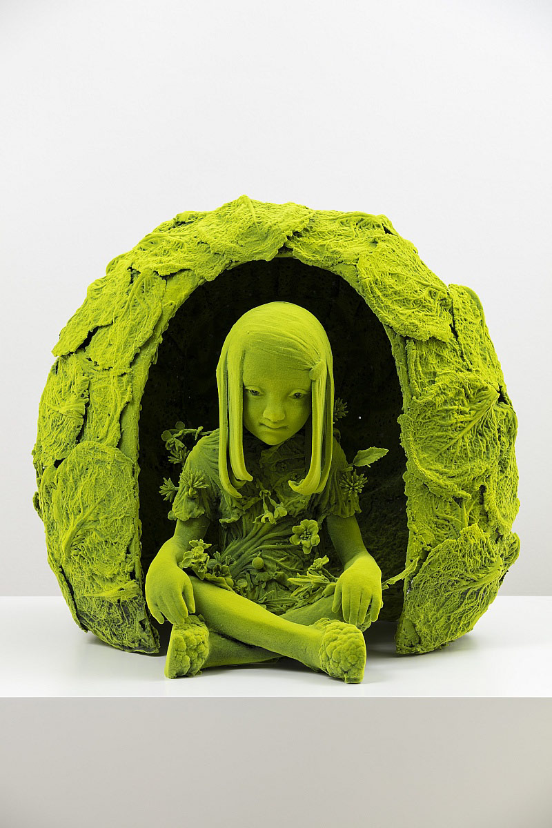 Nukkuva istuva sammaltyttö (Niña de musgo durmiendo sentada), 2018. cerámica, resina epoxi, fibra de nylon. 55,50 × 48 × 58 cm.