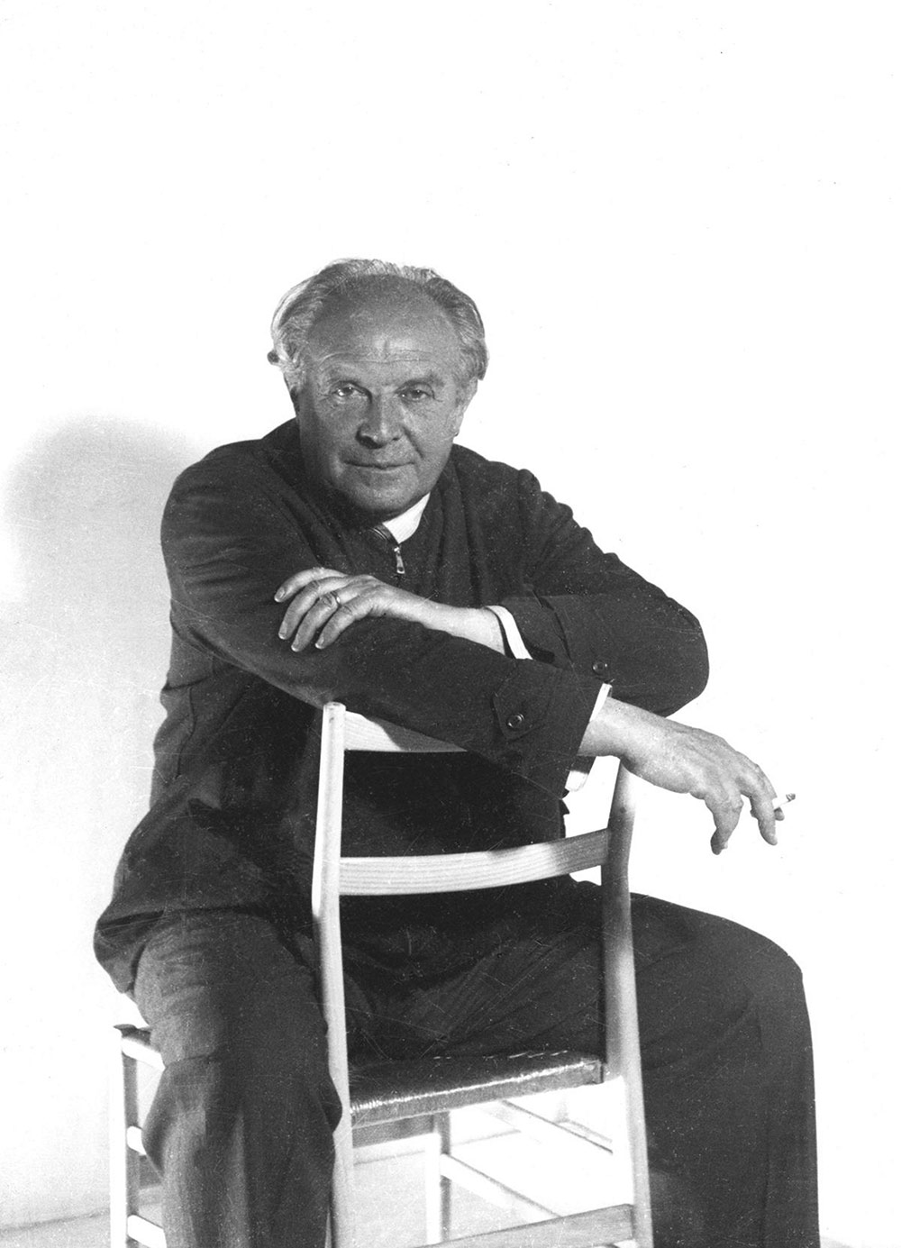 Gio Ponti. 1951, Retrato con la silla ligera 646 de Cassina, Cortesía de los Archivos Gio Ponti, Archivo Histórico. (Foto de Giorgio Casali.)