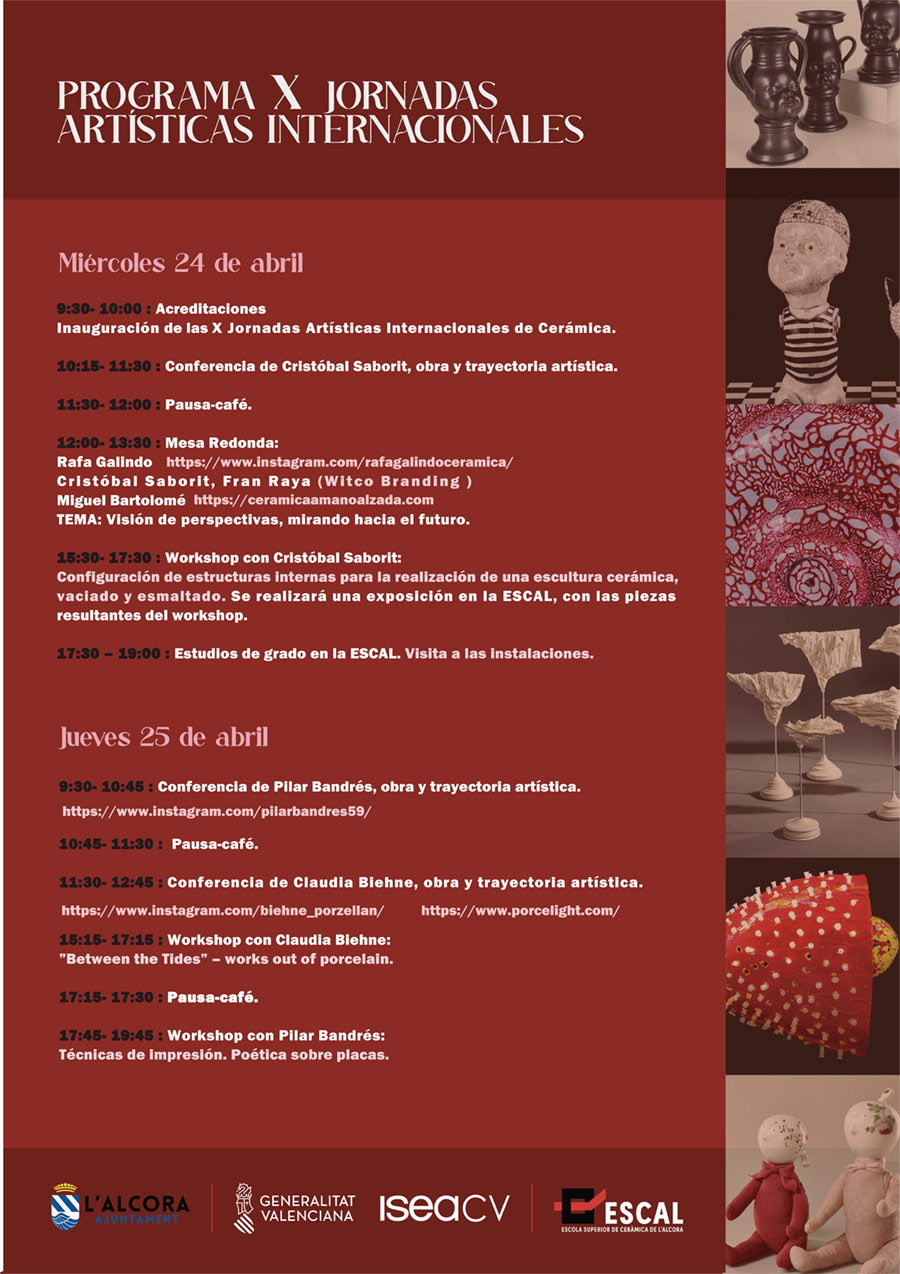 Los días 24 y 25 se celebran en la Escola de Ceràmica de l’Alcora (Castellón) las X Jornadas Artísticas Internacionales, que en esta ocasión contará, entre otros, con Cristobal Saborit, Pilar Bandrés y Claudia Biehne