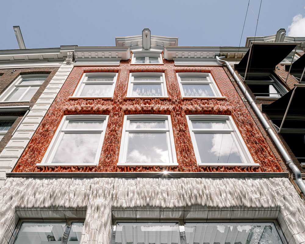 En las plantas superiores, la fachada del edificio presenta ladrillos impresos en 3D esmaltados en tres tonos distintos de rojo. Los ladrillos se componen siguiendo el vínculo cruzado de la mampostería original y presentan una ornamentación abstracta que se desvanece a medida que se elevan. Estos ladrillos se colocan en casetones de acero inoxidable cortados con láser, haciendo referencia a las rasantes originales.