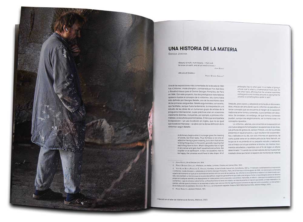 A continuación encontramos un estudio, profundo aunque no demasiado extenso, a cargo de Enrique Juncosa, poeta y comisario de exposiciones (Director y subdirector de prestigiosas instituciones, como el Museo Irlandés de Arte Moderno, en Dublín; el Instituto Valenciano de Arte Moderno, en Valencia, o el Museo Nacional Centro de Arte Reina Sofía de Madrid). Juncosa asume en esta ocasión las tareas de comisario de la muestra, una elección (casi imposición) de Miquel Barceló, y además, en su escrito nos pone en situación sobre la forma en que Barceló introdujo la cerámica en su obra.