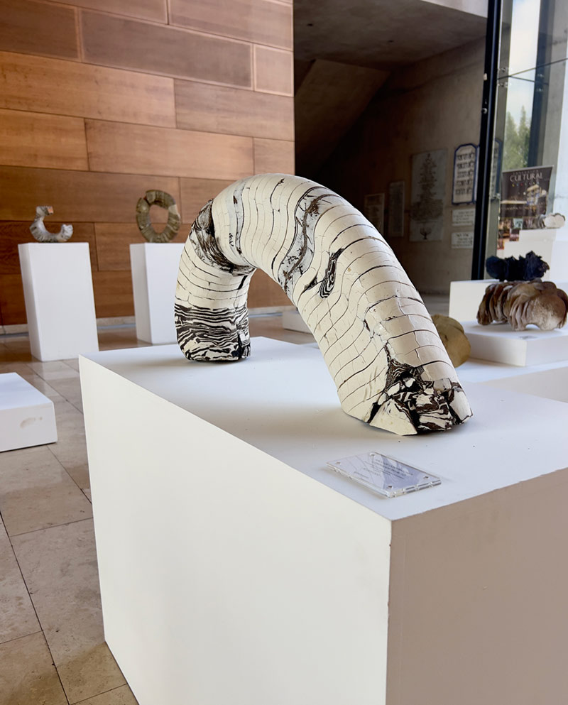 La entrega y el compromiso de Jaqueline con su proceso creativo son palpables, especialmente al sumergirse literalmente en el barro para dar vida a su visión artística. Esta dedicación añade una autenticidad y un significado profundos a cada una de sus obras. Además, la forma en que Jaqueline ha transformado el espacio de exhibición del hall es impresionante; su habilidad para integrar la obra de manera impecable y visualmente impactante realza la experiencia para los espectadores.