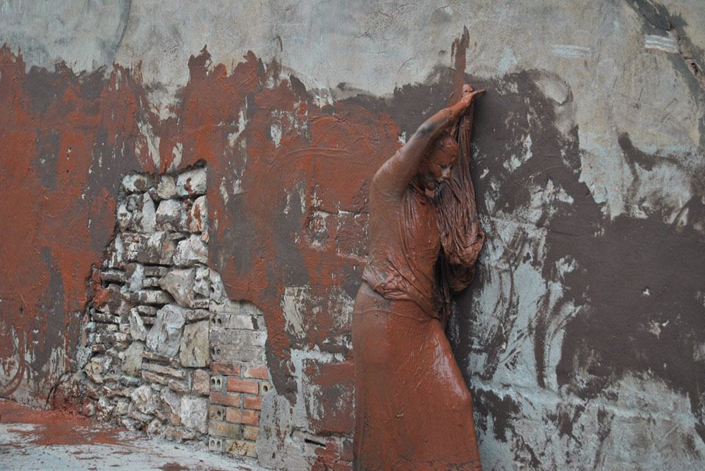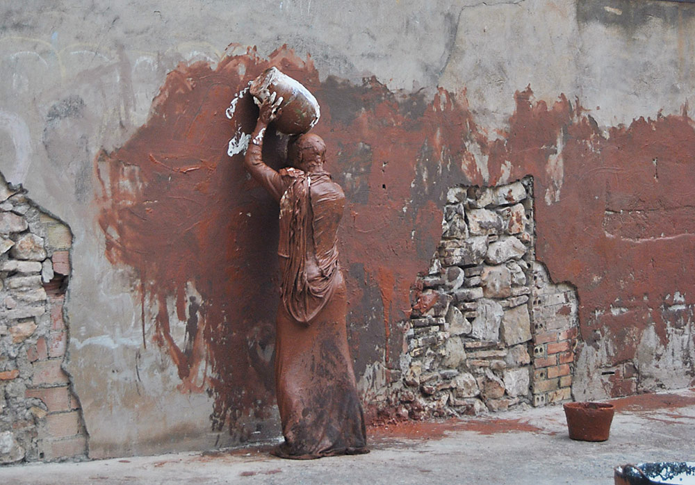 Tras disfrutar del recorrido en el interior de la fábrica con las artistas Moar y Pintos y del viaje emocional que nos ofrecieron, los asistentes pudieron explorar el patio de la Reial, donde sucedería la siguiente acción. Alexandra Engelfriet presentó aquí su performance “la Reial” la cual cautivó a la audiencia que quedó hipnotizada con sus movimientos y su ritual cromático, ondulante y vigoroso en el que ella misma se convierte en pintura y pincel. Engelfriet transporta la barbotina mostrándonos las variedades de arcilla de la tierra alcorina mediante sus tonalidades. Nos hace sumergirnos con ella en este baño pesado de materia que se convierte en una única masa con su danza y que genera todavía otra pieza, una obra pictórica sobre un muro. Este trabajo nos habla de la fuerza, del tiempo y su duración, de la introspección con el silencio del público que puede sentir la respiración del artista, la pesadez de las ropas bañadas en barro. También nos ayuda a pensar sobre el paso del tiempo, con este ritual repetitivo, con esa pieza que queda de forma permanente y que vemos cuartearse y deshacerse.
