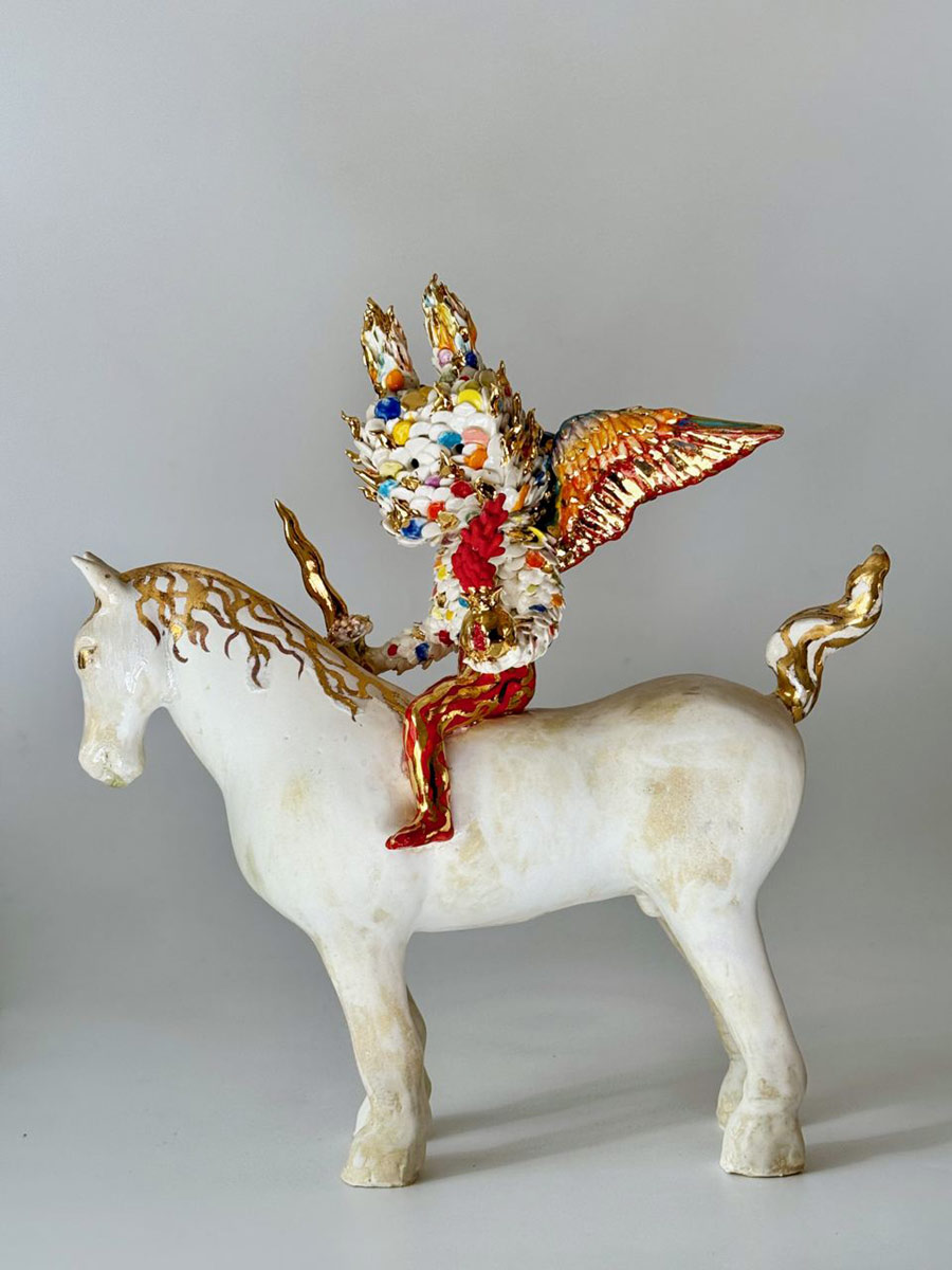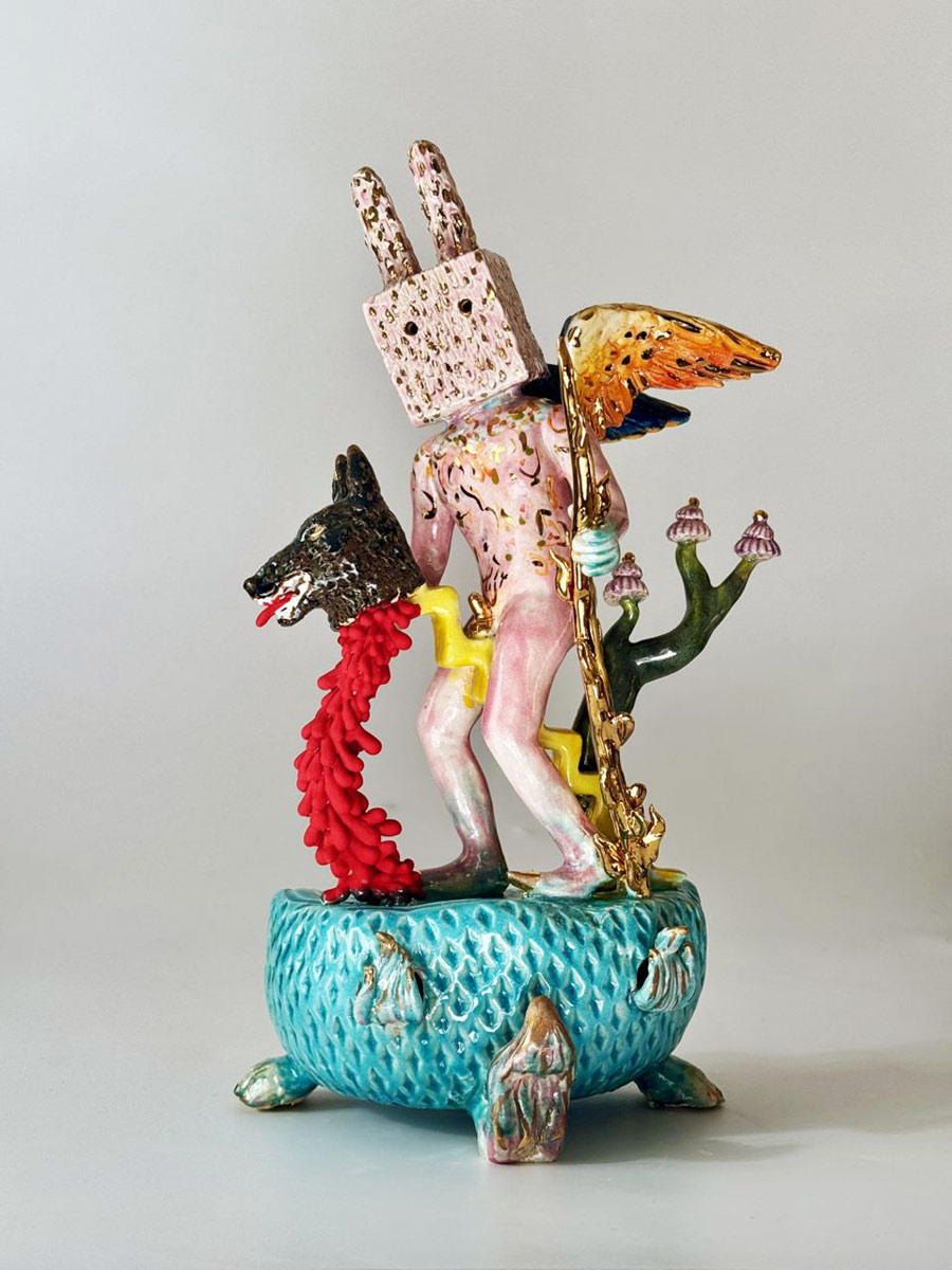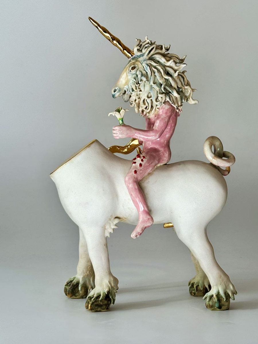 “Impostura” (2024) se compone de una muestra escultórica y de grabados de gran tamaño integrada por piezas cerámicas a gran tamaño, instalación de obra sobre pared de carácter simbólico y mitológico grecorromano, y agrupaciones de piezas bajo el concepto de larario o altar doméstico y bestiarios animales, donde confluyen temas eróticos, oníricos, surrealistas, y religiosos. La obra gráfica dialoga con la colección escultórica en aspectos como la oscuridad y la sacralidad del oro y el sol luminoso, la castración divina o la libertad frente a lo impuesto por un bien mayor y lo imposible en la idealización de las expectativas vitales.