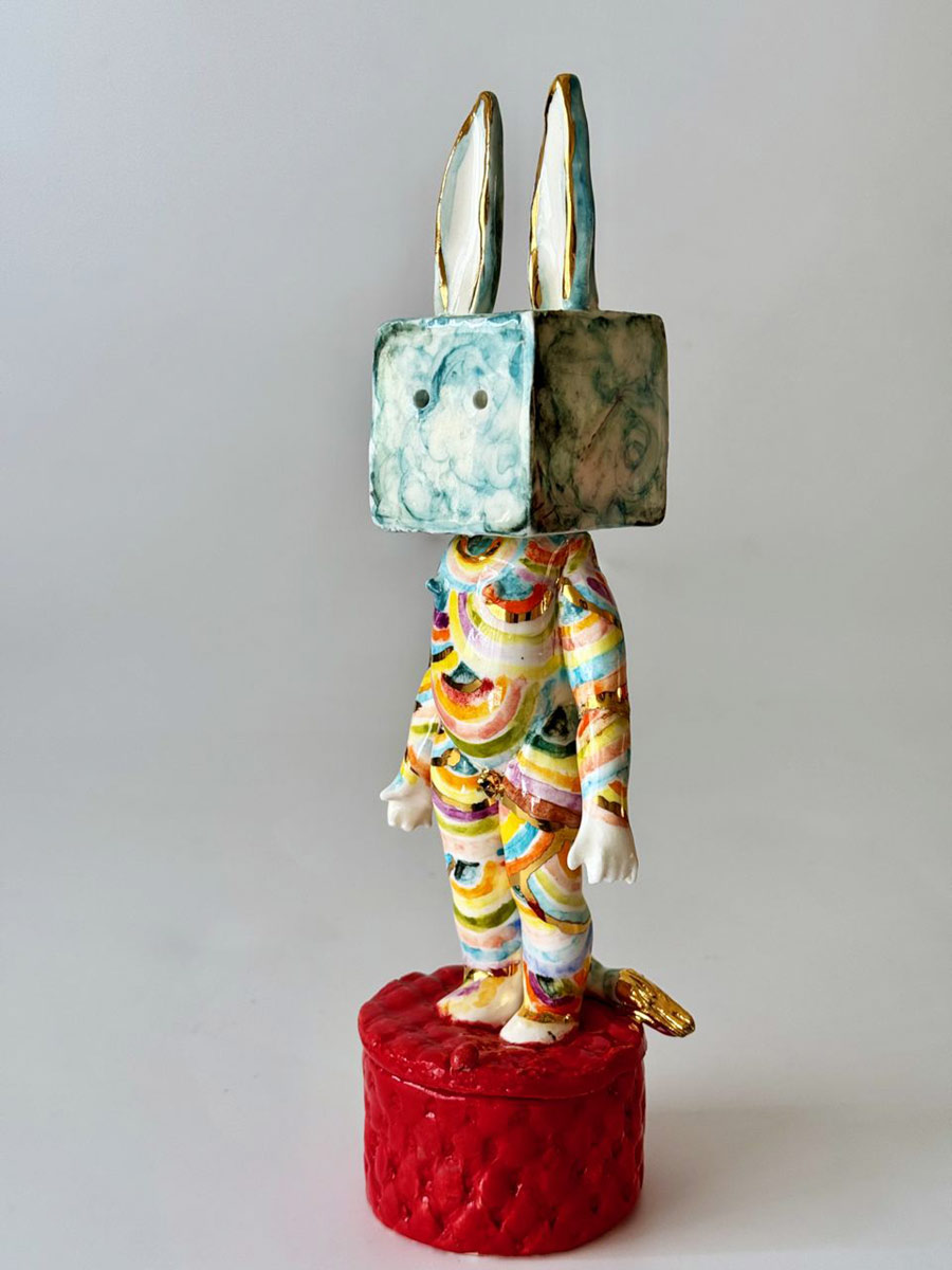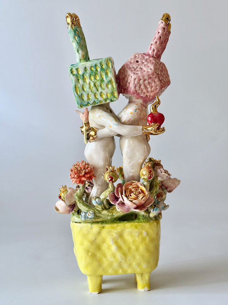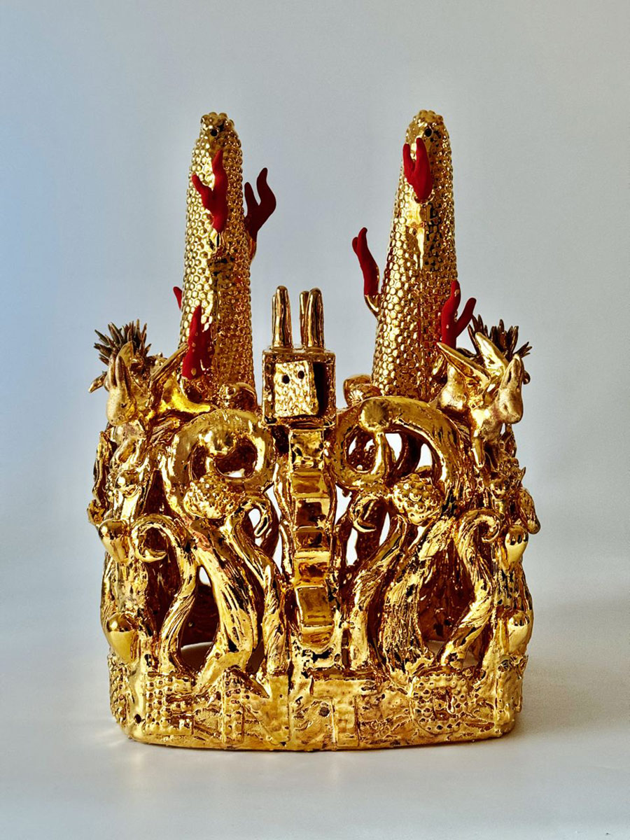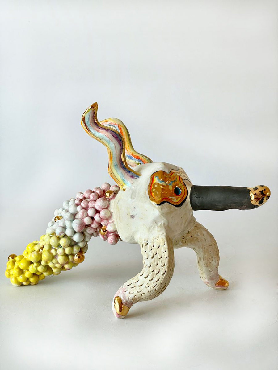 “Impostura” (2024) se compone de una muestra escultórica y de grabados de gran tamaño integrada por piezas cerámicas a gran tamaño, instalación de obra sobre pared de carácter simbólico y mitológico grecorromano, y agrupaciones de piezas bajo el concepto de larario o altar doméstico y bestiarios animales, donde confluyen temas eróticos, oníricos, surrealistas, y religiosos. La obra gráfica dialoga con la colección escultórica en aspectos como la oscuridad y la sacralidad del oro y el sol luminoso, la castración divina o la libertad frente a lo impuesto por un bien mayor y lo imposible en la idealización de las expectativas vitales.