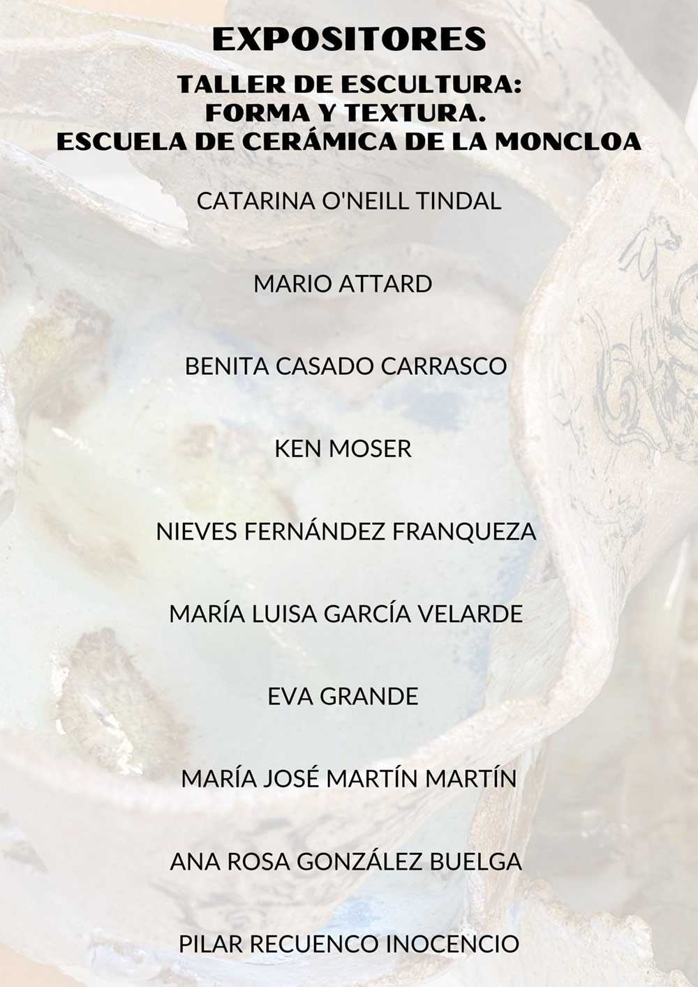 El 27 de junio, a las 13:00 h., tendrá lugar la inauguración en el Museo de Historia de Madrid de esta exposición que recoge los trabajos de los alumnos y alumnas del Taller de Escultura, Forma y Textura de la Escuela de Cerámica de la Moncloa